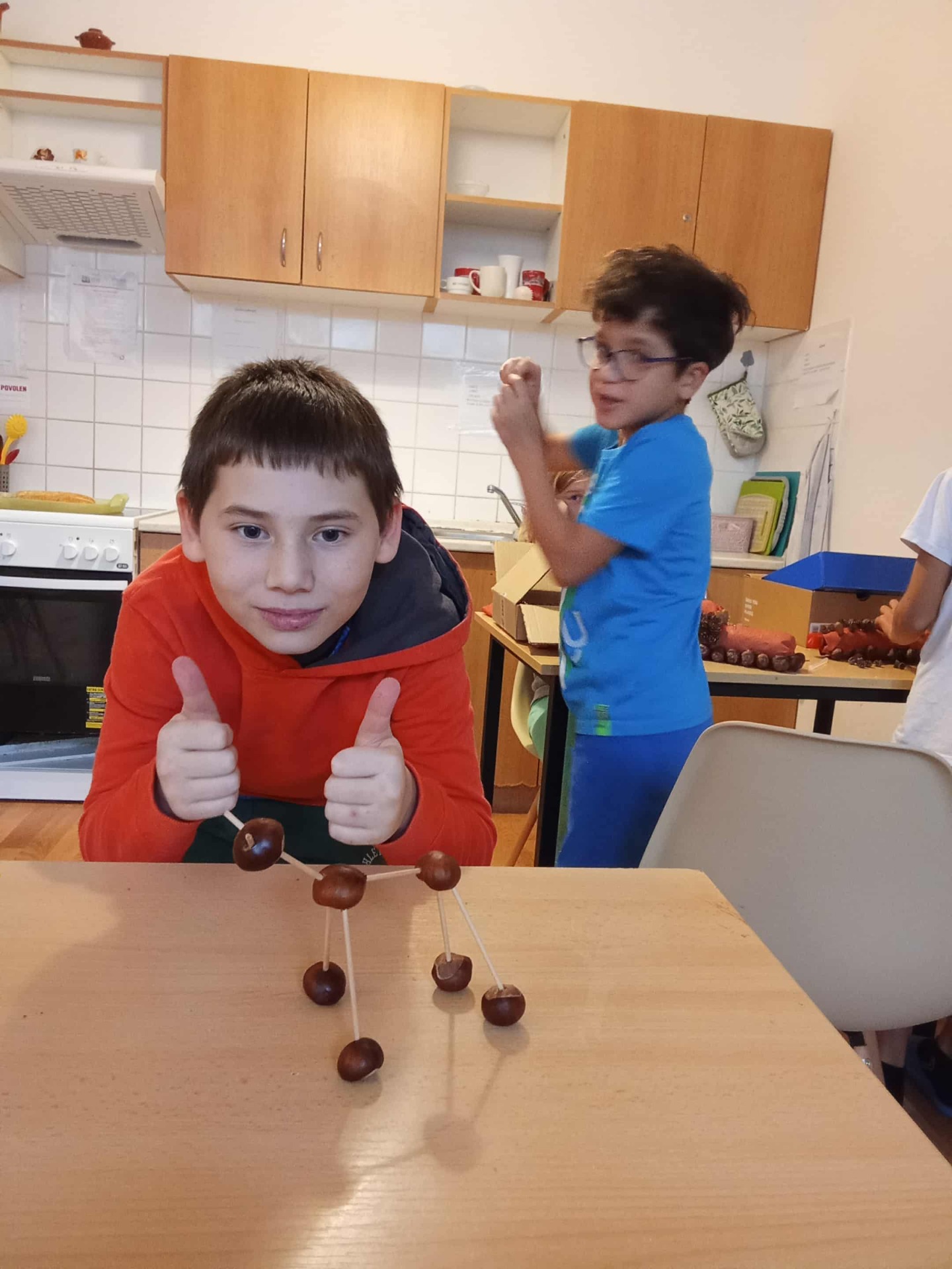 Šišek, žaludů a kaštanů už máme plné krabice, tak se dáme do práce. Vezmu láhev, krepový papír, tavnou pistoli a můžu začít. Ježek bude brzy hotov. Druhé tvoření je na delší dobu, protože musíme počkat, až nám vlna uschne a doděláme obličej. Strašidelná dýně nebo taky Frankenstein. I kostlivec se nám včera povedl a zdobí nám chodbu. Děti domova a teta Monika.